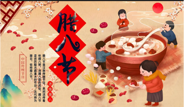 臘八節,節期在每年農歷十二月初八,主要習俗是“喝臘八粥”。臘八節是佛教盛大的節日之一。按佛教記載,釋迦牟尼成道之前曾修苦行多年,形銷骨立,遂發現苦行不是究竟解脫之道,決定放棄苦行。此時遇見一牧女呈獻乳糜,食后體力恢復,端坐菩提樹下沉思,于十二月八日“成道”。為紀念此事,佛教徒于此日舉行法會,以米和果物煮粥供佛。南宋吳自牧《夢梁錄》載:“此月八日,寺院謂之臘八。大剎等寺,俱設五味粥,名曰臘八粥。”自從佛教傳入中國,各寺院都用香谷和果實做成粥來贈送給門徒和善男信女們。臘八這天,各寺院舉行法會,效法佛陀成道前牧女獻乳糜的典故,用香谷和果實等煮粥供佛,名為臘八粥。傳說喝了這種粥以后,就可以得到佛祖的保佑,因此,臘八粥也叫“福壽粥”、“福德粥”、和“佛粥”。“臘八”本為佛教節日,后經歷代演變,逐漸成為家喻戶曉的民間節日。