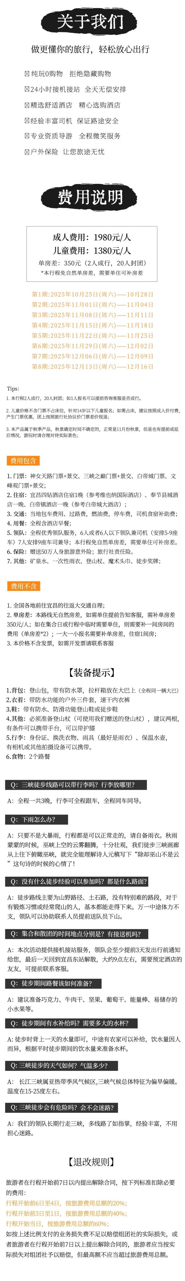 A:只要不是大暴雨,行程都是可以正常走的,請自備雨衣。秋雨蒙蒙的時候,巫峽上空的云霧翻騰,十分壯觀,我們徒步三峽畫廊從上往下俯瞰巫峽,就完全能理解詩人元稹寫下“除卻巫山不是云”這句詩的時候的心情了!