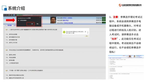 考試過程中系統(tǒng)會調(diào)用選手電腦或手機(jī)攝像頭,進(jìn)入考試時請點(diǎn)擊“允許”,考試結(jié)束后系統(tǒng)將不會繼續(xù)監(jiān)控。