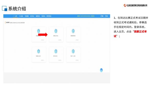 4.到理論考試日期并收到通知后,參賽選手在規(guī)定時間內(nèi)登陸系統(tǒng)-進(jìn)入主頁-點(diǎn)擊“我要正式考試”-選擇要參與的考試名稱-點(diǎn)擊“進(jìn)入考場”并確認(rèn)考試。