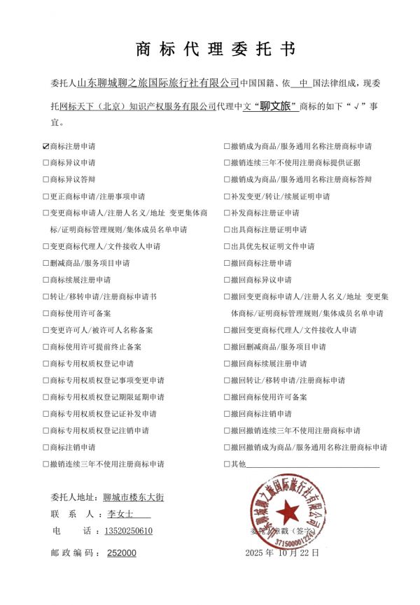 2025年10月22日山東聊城聊之旅國際旅行社有限公司委托網(wǎng)標天下(北京)知識產(chǎn)權(quán)服務(wù)有限公司代理中文“聊文旅”商標事宜。