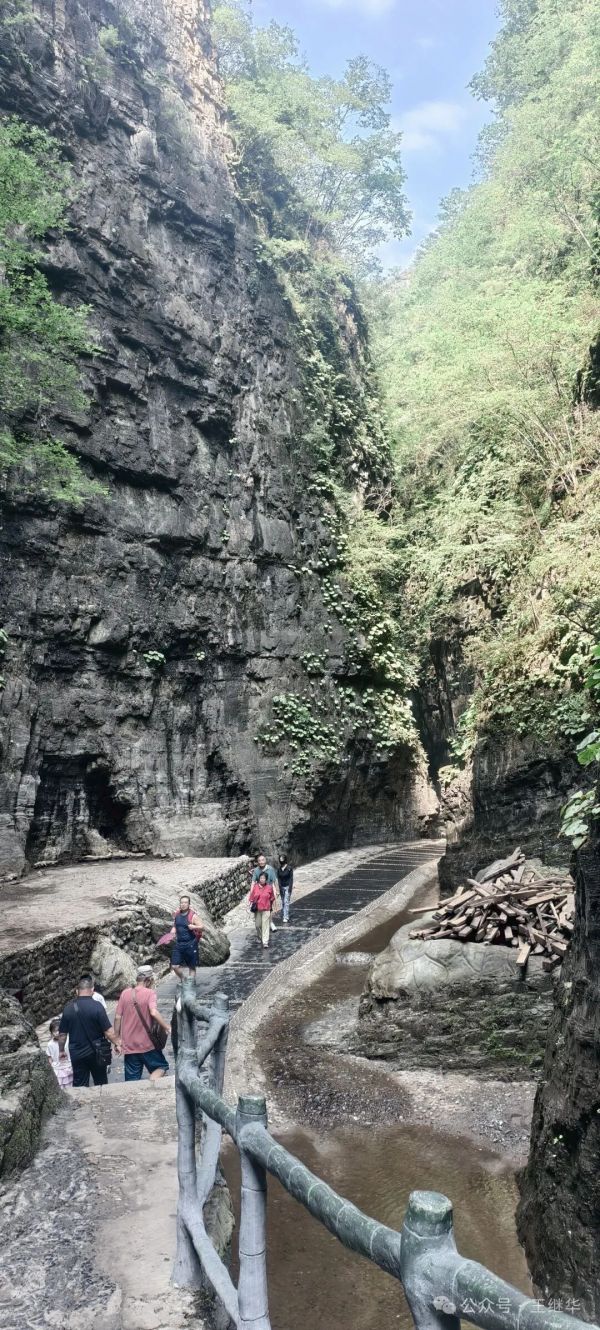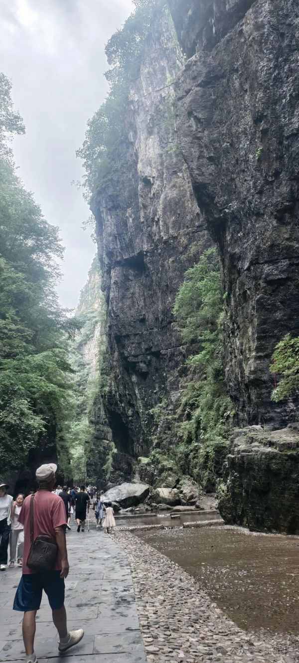 我倆仍然懷揣著對未知的好奇,沿著階梯緩緩前行。峽谷內(nèi)涼爽的氣溫感覺有些冷,抬頭仰望峽谷兩側(cè)的山峰高聳入云,抬頭仰望,天空被切割成一條狹長的縫隙。