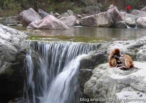 遠遠看到平臺就是游客們觀賞獼猴的地方。太行山獼猴屬于國家二類保護動物,是我國華北地區唯一殘留下來的面臨來絕的靈長類動物,太行獼猴保護區是世界上獼猴分布的最北界,具有很高的欣賞價值、經濟價值、保護價值和科學實驗價值,被世界自然基金組織確定為具有國家和全球重要意義的A級保護區域。保護區山勢險峻,林木茂密,清泉潺流,常有成群的獼猴出沒其間。獼猴共有四、五群,每群幾十只到百只不等。太行獼猴比南方獼猴個大、毛長、絨厚、耐寒,而且都是雙眼皮,短尾巴,毛色光亮,形體俊美。它們性情活潑好動,愛打架嬉鬧,追逐跳躍。每群皆有猴王,各有勢力范圍。行動時,猴王率領哨猴在前,老、幼、母猴居中,強壯的雄猴在前后護衛,相互照應。覓食或休息時,哨猴在高處警衛,一有情況就大聲嘶叫,猴群隨即轉移,保證安全。正是深山風光好,猴子自逍遙。