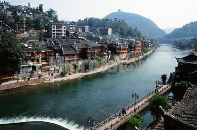 鳳凰古城始建于清康熙四十三年〔1704年〕,歷經300多年的風雨滄桑,古貌猶存。現東門和北門古城樓尚在。城內青石板街道,江邊木結構吊腳樓,以及朝陽宮、古城博物館、楊家祠堂、沈從文故居、熊希齡故居、天王廟、大成殿、萬壽宮等建筑,無不具古城特色。古城以古街為中軸,連接無數小巷,溝通全城。古街是一條縱向隨勢成線、橫向交錯鋪砌的青石板路,自古以來便是熱鬧的集市,如今更加生機勃勃。鳳凰古城的標志性建筑之一虹橋,原名臥虹橋,歷史悠久。鳳凰古城北門城樓本名“碧輝門”,采用紅砂條石筑砌,既有軍事防御作用,又有城市防洪功能,是古城一道堅固的屏障。鳳凰古街兩邊建筑飛檐斗拱,店鋪陳設著琳瑯滿目的民族工藝品,濃濃的古意古韻,透出古街深厚的民族文化底蘊。