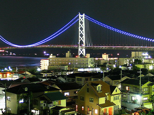 明石海峽大橋:連接本州島和淡路島的明石大橋,于1998年4月開通,全長3,911米,是世界上最長的吊橋。夜晚時候開起燈火,整座大橋猶如珍珠裝飾,故有“珍珠大橋”的美稱。燈光的開放十分講究,平日開四季之顏色的燈,周末與節日開藍綠色的燈。舉辦活動時,燈光顏色會不斷變化。報時的時候,整點是彩虹色、半點是寶石色。