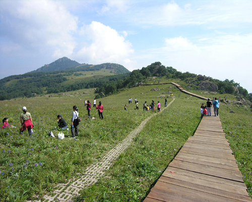每年五月份,山下春意融融,鳥語花香,山上仍有長達100多米的冰川,這種奇特的“冰川杜鵑”景觀,令許多旅客贊嘆不已。形成“一山有四季,上下不同天”,白草畔是河北省太行山腹地保留的一處唯一以安山巖石林和森林相匹配的生態系統。安山巖呈紅色,發育了許多奇特的巖柱景觀,有的像人有的像物,造型奇物,安山巖地貌上發育了大面積原始森林,石林加森林,號稱“二林競秀”。