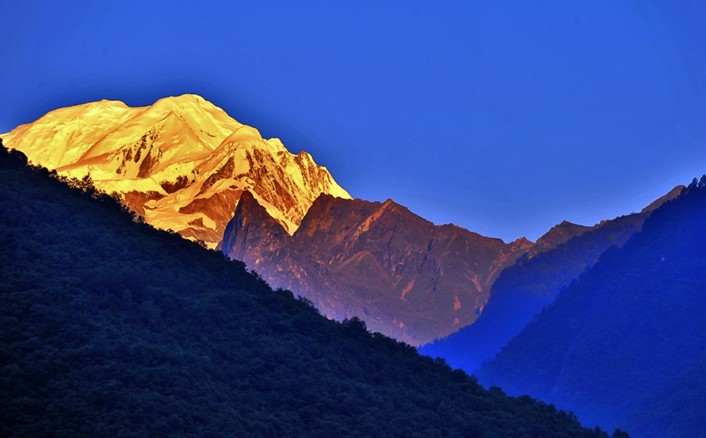 貢嘎山(Minya Konka)位于四川省康定以南,是大雪山的主峰。周圍有海拔6,000公尺以上的山峰45座,主峰更聳立于群峰之巔,海拔7,556公尺。高出其東側(cè)大渡河6,000公尺,被喻為「蜀山之王」。主峰由花崗閃長巖組成,受海洋季風影響,雪線海拔4,600∼4,700公尺,冰川發(fā)育規(guī)模較大。東坡最大的海螺溝冰川長14.2公里,末端下達2,850公尺,已落入森林帶內(nèi),在長期冰川作用下,山峰發(fā)育為錐狀大角峰,周圍繞以60°∼70°的峭壁,攀登困難。1932年,美國探險隊攀登成功。中國大陸登山隊于1957年6月到達峰頂。