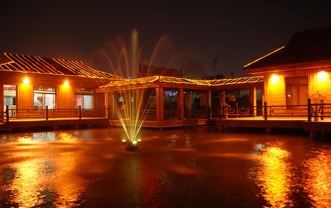 江北水寨系東昌湖綜合開發的重點項目之一,在借鑒眾多湖上竹寨建筑風格和模式的基礎上,結合東昌湖自身特點,大膽進行了調整和改善,使其布局更加合理,形式更加活潑,功能更加齊全,風格更具特色。版權所有山東聊城聊之旅國際旅行社有限公司,轉載必究!整個建筑由棧橋、回廊、亭臺軒榭組成。內置可容70余人的餐會廳一座,另有10間餐廳、其中5間可供游人作為垂釣包廂,前后門貫通,面湖可放鉤垂釣,大廳與包廂之間棧橋相連,中間為一露天廣廳,可供游客輕歌漫舞。江北水寨樓臺軒榭,互相映襯,湖光城影,相映成趣,建筑風格古樸典雅、錯落有致,極具江南水鄉之風彩。