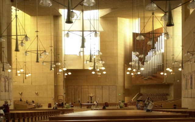 教堂占地二千余平方尺,頂部為鐘樓。禮堂高大寬敞,可容二百多教友同時(shí)參加儀式;圣壇上置圣母像,據(jù)說(shuō)是從歐洲運(yùn)來(lái);其兩側(cè)有數(shù)尺高的天使像,造型栩栩如生,是為紀(jì)念建堂百周年而置。