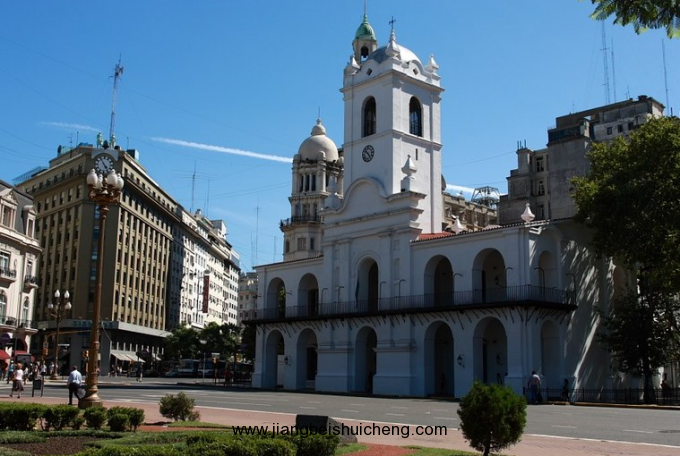 阿根廷國會大廈位于國會廣場西端,是阿根廷的立法機關,大廈于1887年至1906年建成。大廈主體有4層,以白色大理石裝飾墻面,帶雕飾的希臘式立柱環繞整個建筑。大廈正中高高聳起一座穹頂塔樓,塔身半腰處,一輛青銅四架馬車凌空欲飛,最高處是直徑20米的青銅穹頂。建筑的氣勢與精美,不輸于華盛頓的國會大廈。屹立在大廈前面的兩會紀念碑氣勢宏偉,工藝精美。