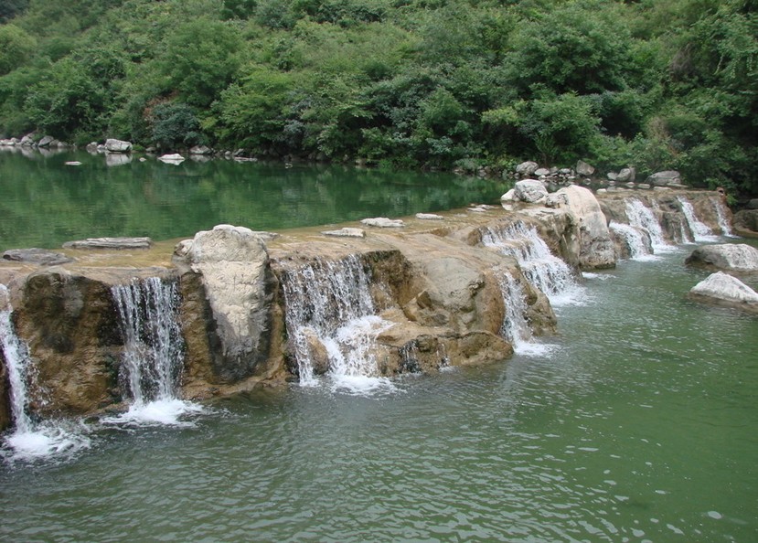三、潭瀑峽地處云臺山北部略偏西,是主要河流子房河的一個源頭。溝長2000米,南北走向。溝東面,峭壁聳翠,基巖裸體。溝西面,競秀峰參差俏麗,峰群一字排列,峰峰直立,爭奇斗異。在曲曲彎彎的溝槽內,瀠洄著一條會唱歌、會跳舞的溪水。這條能歌善舞的溪水叫小龍溪。它的溪床,由一層層高低不一、色彩有別、寬窄不同、曲折有致、形態各異的自然山石臺階所組成。小龍溪則像一隊美麗的歌舞明星,以層層臺階作舞臺載歌載舞,翩翩歷階而下。并在每個石階舞臺上,表演出精彩的節目,奉獻出妙不可言的美景。或碧波蕩漾,或為溪布,或分水涓涓細流,或匯合湍湍激流,或傾瀉、或跌落成為銀光閃閃的瀑布,瀑下積水,成為彩潭。色澤悅目,清音悅耳。承蒙大自然造化的神奇,逆水而行,有如游仙,步步引人入勝,美景層出不窮,好戲連臺,演奏出十二部美好的山水樂章。即:迎賓第一潭、九對情人、翡翠仙子、金潭銀瀑、丫字瀑潭、群芳競秀、隋唐山寨、清漪仙池、水簾仙居、碧玉仙子、仙蹤劍影、龍鳳呈祥。
