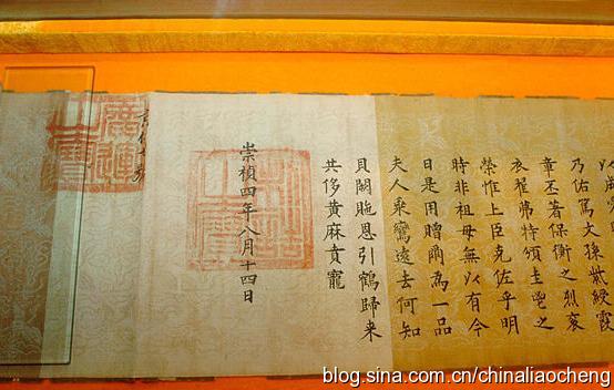 博物館館長劉新華先生介紹,這處“圣旨”博物館為二層仿古建筑,展出面積1000多平方米,館藏明代、清代的詔書、國書、誥封、敕封(通稱為圣旨) 達132道之多,開館展出的“圣旨”55道,以及“偽滿洲國圣旨”和日本、越南、韓國等國家的“圣旨”,并配以明清時期的科舉試題、殿試卷、官場文書、字畫匾牌及用墨魚汁做墨汁密寫在衣衫內(nèi)的“夾帶小抄”等科舉文物2000多件,反映了當時的政治、經(jīng)濟、軍事、外交及中國宮廷文化等多種形態(tài)。