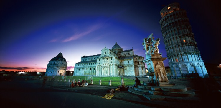 奇跡廣場(chǎng)又稱主教堂廣場(chǎng),位于意大利托斯卡納大區(qū)比薩市中心,廣場(chǎng)上有四大建筑: 主教堂、比薩斜塔(鐘樓)、圣喬凡尼洗禮堂、洗禮堂墓園,廣場(chǎng)周圍還保留著古代的城墻和城門,中間有大片的草地。奇跡廣場(chǎng)上始建于1063年的這組建筑深刻影響了從11世紀(jì)到1284年的建筑發(fā)展和14世紀(jì)的藝術(shù)發(fā)展,堪稱中世紀(jì)基督教建筑的典范。教堂大廳中的銅制吊燈被稱為“伽利略吊燈”,當(dāng)年19歲的伽利略在教堂內(nèi)觀察到吊燈的擺動(dòng),發(fā)現(xiàn)了小擺動(dòng)的等時(shí)性定律,這是他動(dòng)力學(xué)研究的序幕,在比薩斜塔頂?shù)?ldquo;兩個(gè)鐵球同時(shí)落地”的實(shí)驗(yàn)則使他得出了自由落體定律。圣喬凡尼洗禮堂則是意大利最大的洗禮堂。至于奇跡廣場(chǎng)的得名,則是來(lái)自于意大利作家鄧南遮1910年出版的一部小說(shuō)中的句子“Ardea旋轉(zhuǎn)了基督的天空,旋轉(zhuǎn)了奇跡的草地。”