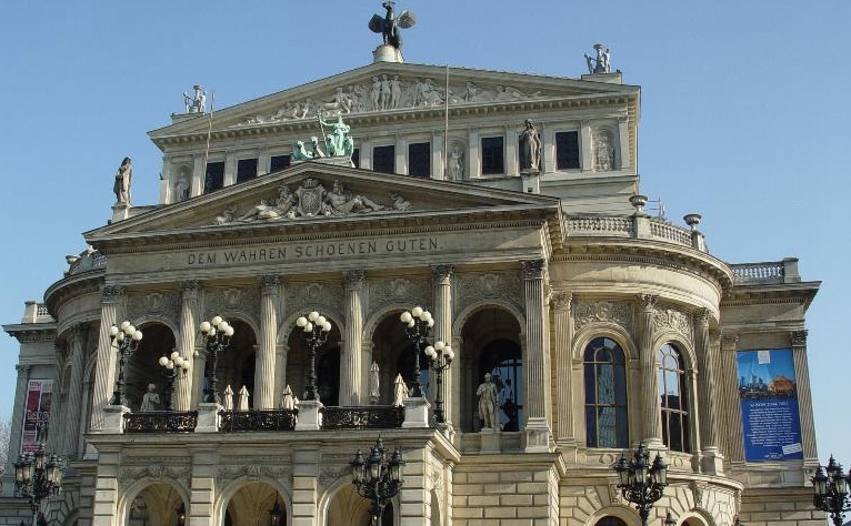 開演當年威廉一世皇帝觀看了首場演出之后,大為感動,宣布說唯有法蘭克福能繼承如此金碧輝煌,1945年戰爭以后它完全成為廢墟,七十年代末的修繕共花費了兩億四千萬馬克,新建采用新古典主義式。