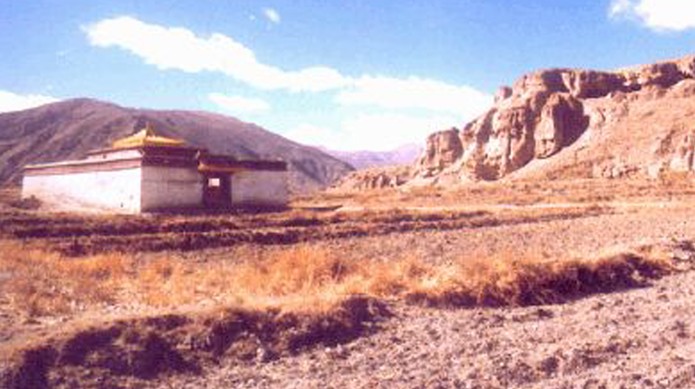 位于木惹山的半山腳下,有一規(guī)模甚大的土石高臺,據(jù)《歷史明鑒》等藏文史籍記載,這里應(yīng)是都松芒布結(jié)的陵墓。這里的地面建筑除了高大封土之外,最有價值的要算是陵前的一對石獅。石獅高1.55米,座子為長方形,長1.2米、寬0.76米。石獅面向陵丘坐立,挺胸昂首,形象雄健生動。鬃毛成列垂于腦后,頭頂平整無鬃,一看而知是早期石獅的風格。整個石獅的雕刻技法高強,線條流暢圓潤,在全國唐代石雕中也屬上乘,在西藏更是難得。