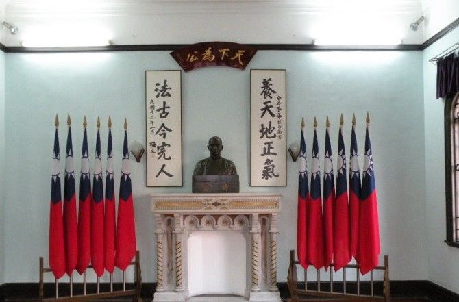 鐵門兩邊原本鑲有中國國民黨黨徽。「一二•三事件」發生後,當時的澳門市行政局在1967年1月2日發出公告,禁止在澳門懸掛和顯示敵對中華人民共和國的外國旗幟、徽章和標志。次日,澳門政府派員到該館拆除鐵門,并以專門訂造的,沒有中國國民黨黨徽圖樣的鐵門取代。不過,展覽館內孫中山先生半身像兩旁仍然可以展示中華民國國旗,成為澳門唯一一處可以公開展示中華民國國旗的地方。