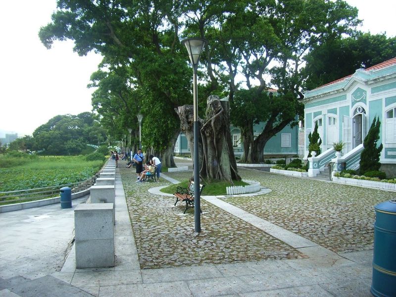 海灣昔日曾為水上飛機(jī)起落點(diǎn),一九六八年后形成了海灘一大片紅樹林。岸邊砰石馬路旁,五座一列的葡式建筑,興建于一九二一年,如今掩映在綠樹中,成為游人喜到之處,更成為拍攝婚紗相的好地方。