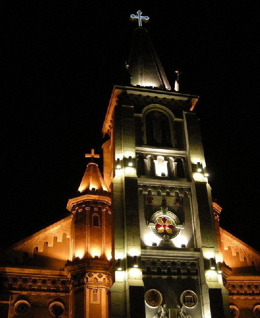 教堂設有三間大殿,主殿建筑富麗堂皇,給人的感覺肅穆而深沉。在教堂的主殿與堂身之間有一道由實心磚筑造的拱門。
