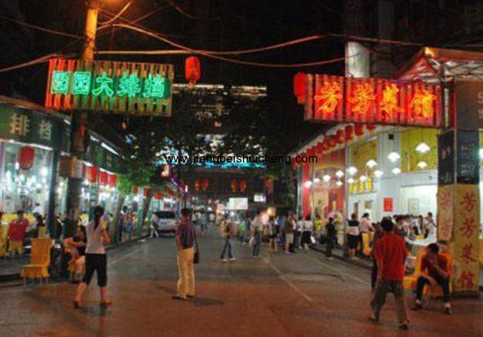 “吉慶街白天不做生意,就跟死的一樣。”池莉在《生活秀》中如此直白描繪。吉慶街在白天就是一條普通、安靜的小街,與近在咫尺、喧囂繁華的中山大道比起來,實在是清冷寂寞、反差強烈。一到晚上,短短170米的小街在霓虹下頓然活了過來。十米寬的小街上,簡易的圓桌板凳連綿排開,賣花的、賣唱的、拉琴的、吃飯的、擦鞋的……你還沒搞清楚這些人是從哪個角落冒出來,而他們已經甩開嗓子吆喝著和你做起了生意。轉眼間,人潮暗涌,催促著你盡快落座,識趣的老板娘一邊熱情地張羅,一邊和拉琴賣唱的藝人交流眼色,在一幫人的簇擁中迷迷糊糊坐定,回過神來才發現,自己到底進了“芳芳”、“明明”、“順記”、“園園”、“小妹”、“玲玲”、“歪歪”哪家排檔,猝不及防,只能搖頭一笑。幾百個臺位滿滿當當,燈火映紅了一張張恣意滿足的笑臉,各色菜肴任君選擇,吹拉彈唱的賣藝人隨你召喚。這些飽經世事滄桑、混跡于三教九流、游走于龍魚之間的藝人,不僅可以為你演唱各種戲曲、民謠,還善于察言觀色,在你觥籌交錯,酒酣耳熱之際,用最時尚的妙言諧語為你現編現演,一首首流行歌曲和民謠演繹得讓你忍俊不禁、捧腹開懷。據說,吉慶街的藝人有藝術院校的學生,有音樂學院的教授,還有寫字樓的白領。版權所有山東聊城聊之旅國際旅行社有限公司,轉載必究!午夜十二點,整個氣氛達到了高潮。對吉慶街來說,夜是白晝,生活理所應當是從此刻開始的。買賣人不知疲倦地做生意,直至凌晨四點依舊精神抖擻、聲音洪亮,食客們卸下白日里的憋悶,一口氣興奮到深夜,不知歸去。這個不夜城給人的就是一個歡暢和痛快,難怪讓人愛到了骨子里,美得妙不可言。吉慶街沒有安靜的茶莊,沒有高檔的餐廳,市井味道的排檔是擺了一排又一排。席間的食客形形色色,大學教授、知名作家隱于其中,文藝界、體育界、政治界人士頻繁捧場,各種口音的中國人,不同國籍的外國人更是流連忘返。排檔將這種面對面的消費方式和平民化的表演方式渾然天成地糅合在一起,沒有絲毫地矯揉造作,很是對了。吉慶街,是全國惟一的可以占道經營的場所,這可以說是幾經取締又重生的吉慶街獨享的特權了!這就是吉慶街的文化大排檔,它將面對面、開放式的消費方式與隨意性、平民化的表演方式并浸潤在極具地方特色的民風民俗之中,構成了獨具特色、遠近聞名的飲食文化超市,吸引著上至白領官員、下至藍衫小民以及外地游客紛至沓來。 排檔在很多很城市早已消失,但是在大武漢,還是經營得風生水起。還是漢味作祟,武漢的大熱天,特別是晚飯后,硬逼著人們在家里呆不住。三三兩兩地,男人們打著赤膊,在外干什么呢?坐在竹床邊吃毛豆喝啤酒最爽快。二十世紀的八、九十年代,一些勤快的嫂子、夫婦、父子從家里抬出竹床放在屋前臨街的路上,竹床上放著涼面、米粉、米飯、雞蛋、涼菜、自己鹵好的牛肉、牛肚、牛筋、肥腸、雞鴨等,旁邊生一個小煤爐,炒點家常菜,支一、兩個小桌小凳,人們就地坐,吃著喝著,“挖地佬殼”的每天都有鈔票進賬,那時,“下崗”一詞還很少聽見,那些有工作的嫂子們靠這種方式賺錢貼補家用。再后來,一撥人又來了,他們干脆租下門面,十幾個、二十幾個平方都能開店,幾張桌面擺到街上,小家小菜的,號稱“靠杯酒”,很符合武漢市民的口味。到九十年代初期,生意再次做大,門面大了,生意的規模大起來。1933年左右為吉慶街的最高峰時期,形成了以吉慶街為中心,包括鄰近的交易街、瑞祥路、大智路在內的大排檔市場。武漢,正邁出十二五規劃的第一步,作為肩負城市使命的中堅力量,忽然意識到,對這座城市的熱愛與尊重不該是反復地修整、一味地改變,直到喪失過去的記憶,遺忘美好的當時,而該承擔地是文明科學運營城市的同時,讓悠久的漢文化深入建筑、景觀的骨髓,讓它得以傳承、光耀。吉慶民俗文化街正是在滿足武漢人精神飛躍的同時,吸納了上百年老武漢的歷史文化因子,加以創意的聚合、活力的升華,未來它將呈現給武漢人的既是忘不掉的過去,又是更美好的未來,這樣的情節才會沁透于心。武漢文化底蘊深厚,有"京劇之母"美譽的漢劇,便鼎盛于漢口, 最終與徽劇合流,誕生了國粹京劇。“過早戶部巷,宵夜吉慶街”,武漢人素有此說。每當夜幕降臨,華燈初上,吉慶街燈火輝煌,人聲鼎沸,各類美味佳肴應有盡有,漢味民間表演各具韻味,美食文化和民俗文化在這里交匯,中外來賓和八方游客在這里歡聚。這里已成為領略武漢都市風情的窗口。吉慶街位于漢口著名的老字號“豆皮大王”老通城酒樓附近。東起大智路,西至江漢路。別看這條有名的吉慶街夜市大排擋寬不過十幾米,路面凸凹不平,白天冷冷清清,可一到晚上,它的魅力便凸現出來,賣花的、賣唱的、拉琴的、吃飯的、服務的……幾百個臺位擠得滿滿的,熱鬧非凡,版權所有山東聊城聊之旅國際旅行社有限公司,轉載必究!特別是在午夜12點以后,整個氣氛達到高潮。這里沒有安靜的茶莊,沒有高檔的餐廳,但是你一不留神就可以從客人里找出大學教授、作家或社會學家什么的。吉慶街的客人們形形色色,不光是文藝界,還有體育界、政界;不光是中國人,還有外國人,不光是為吃而來,更多的是想感受這里自由的氛圍,體味這里濃濃的漢味風情。