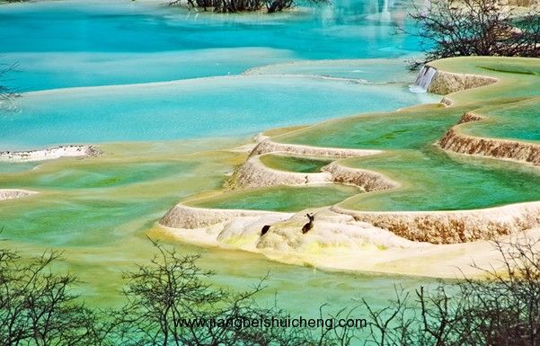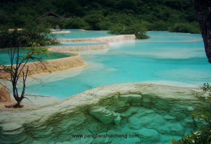 進入黃龍景區,首先看到的是一組精巧別致、水質明麗的池群--迎賓池。池子大小不一,形狀奇特,色彩艷麗,錯落有致,四周山岳環峙,林木蔥蘢,山間野花競放,彩蝶飛舞。山間石徑曲折盤旋,點綴著觀景亭閣,倍添情趣。
