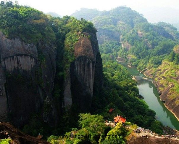 幔亭峰橫欹在大王峰北側,其麓相連,高不及大王峰。峰頂地勢平坦,有一片巨石,狀如香鼎,叫做宴仙壇。相傳當年武夷君曾在此設幔亭宴會鄉人,“幔亭”之名即由此而來。據宋祝穆《武夷山記》載:秦始皇二年八月十五日,武夷君與皇太姥、魏王子騫等十三仙人,在又平又寬的峰頂張幔為亭,結彩為屋數百間,大宴鄉人。應召而來的男女二千多人,循虹橋魚貫而上,到了峰頂,幔亭、彩屋鋪著紅云茵、紫霞褥,金宇綴花,馨香氤氳;鼓樂齊鳴,歌聲嘹亮;席間食品全非人世間所有。這個幔亭招宴的故事,流傳千年,至今不衰。幔亭峰丹崖峻拔,蒼松環簇,好似一座巨大的翠屏,南宋辛棄疾有詩道:“山上風吹笙鶴聲,山前人望翠云屏。蓬萊枉覓瑤池路,版權所有山東聊城聊之旅國際旅行社有限公司,轉載必究!不道人間有幔亭。”鐫在幔亭峰東壁的“幔亭”二字,大四方丈,為明吳思學所書。峰的半腰有一片巨石,渾然方正,上大下小,約莫可坐數十人,俗名“棋盤石”。相傳當年漢武帝派遣使者來武夷山,是在這里用乾魚祀武夷君的,所以又稱漢祀壇。司馬遷《史記》上都有記載。