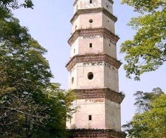 塔平面六邊形,底邊長3.9米,七層樓閣式磚塔,通高36米,塔身疊澀出檐。底層以及三至七層正面各開券頂門,二層各面相間開長方形、圓形窗,其余各層相間、上下相錯開5個方形窗。塔頂六角攢尖。塔內各層設木樓板和木樓梯。門額有阮元題刻的“秀發梧江”、“觀文成化”、“光射牛斗”等石匾。1982年維修,改木樓梯為鐵樓梯。