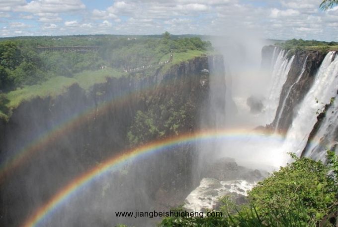 維多利亞瀑布的寬度和高度比尼亞加拉瀑布大一倍。年平均流量約935立方米/秒(33,000立方英尺/秒)。廣闊的贊比西河在流抵瀑布之前,舒緩地流動在寬淺的玄武巖河床上,然後突然從約50米(150英尺)的陡崖上跌入深邃的峽谷。主瀑布被河間巖島分割成數股,浪花濺起達300米(1,000英尺),遠自65公里(40英里)之外便可見到。每逢新月升起,水霧中映出光彩奪目的月虹,景色十分迷人。瀑布聲如雷鳴,當地卡洛洛-洛齊(Kalolo-Lozi)族居民稱之為“莫西奧圖尼亞”(Mosi-oa-tunya),意即“霹靂之霧”。據考證,遠在公元90年即有少數農業人口在贊比西河兩岸定居。版權所有山東聊城聊之旅國際旅行社有限公司,轉載必究!多數原住民則在距瀑布半徑128公里(80英里)范圍內以漁獵為生。今日當地部族有東加人、洛齊人、萊雅人(Leya)、托卡人(Toka)和蘇比亞人(Subia)。東加人每年在瀑布旁舉行雨祭,將黑色公牛扔入峽底祭奠河神。1855年11月16日,英國探險家利文斯頓(David Livingstone)抵達瀑布所在地,為第一個見到該瀑布的白人。1905年在瀑布附近的峽谷上建成跨度200米(657英尺)的拱形鐵路公路兩用橋。贊比亞一側建有兩座水電站,發電能力共10萬千瓦。維多利亞瀑布國家公園與李文斯頓狩獵公園形成瀑布地區。瀑布地區已成為非洲著名旅游勝地。