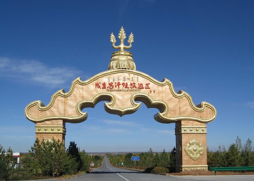 距成吉思汗陵園東西1公里,又有成吉思汗敖爾敦(行宮),這是仿照成吉思汗1206年即大汗位時的行宮布局而建造的,人們又叫它“元代村”。行宮由迎賓牌樓、大宮門、金頂大帳、左右側展、選汗高臺、射獵場、賽馬場等部分組成。