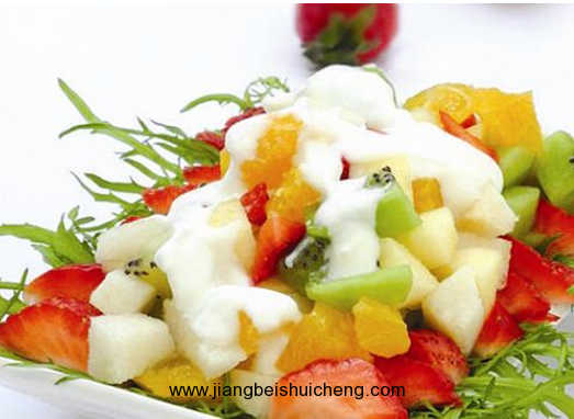 用酸奶代替沙拉醬做成了酸奶沙拉,不僅少去了沙拉醬的油脂,而且比沙拉醬更有營(yíng)養(yǎng),而且草莓口味的,口感也更清爽。