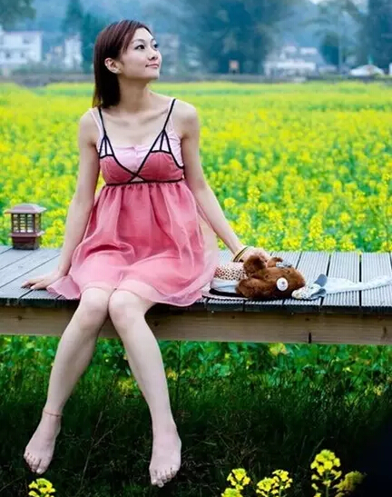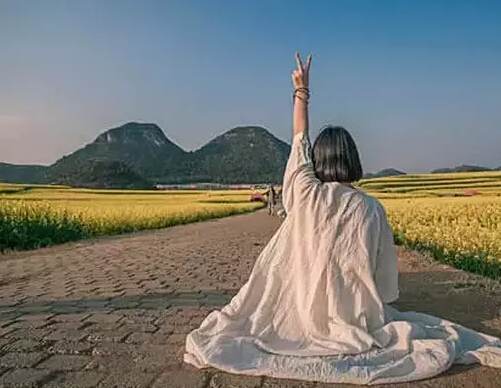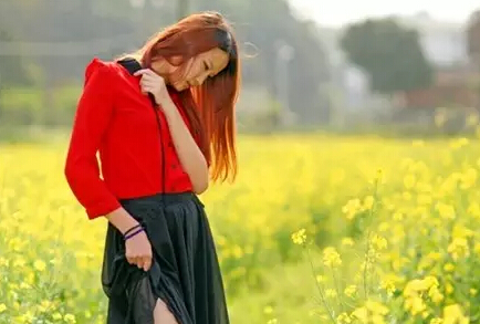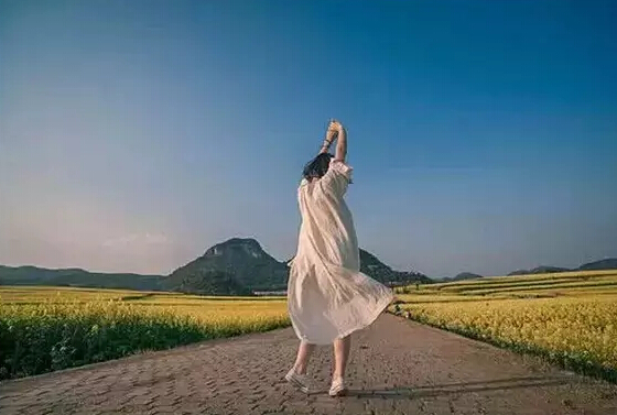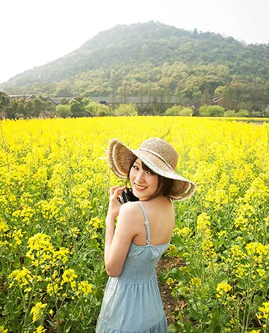 油菜花屬于清新系列的色調,搭配的服裝,顏色一定選擇淺色系的,千萬不要想著去和花爭艷,穿個大紅大紫的。