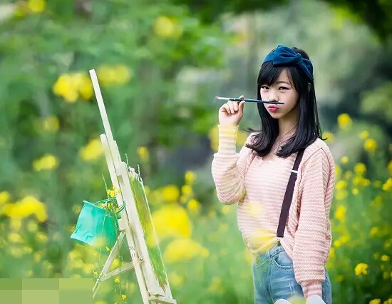 3、高級——畫板,帶著畫板,整個構圖就會更豐富,表情一定要夠生動,要展現一個在油菜花地里寫生的文藝狗,但是用畫板的話一定要注意構圖,注意畫板擺放的角度和位置。