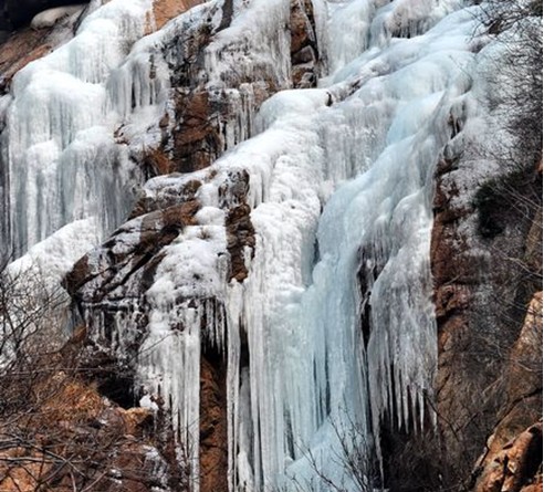 從北九水景區看到,未始潭、無隅潭等背風的水面都結了接近1厘米的薄冰,許多落葉被冰凍在晶瑩剔透的冰面里,如同一塊大琥珀。通往蔚竹庵一個20多米高的瀑布已經沒有了瀑布流淌的水聲,潔白的瀑布凝固在懸崖上,被定格成壯觀的冰瀑。隨著太陽逐漸升高,開始融化的冰瀑在流水的浸泡下顯得更加晶瑩剔透。許多游客被眼前的壯觀景象所吸引,紛紛拿起相機拍照留念。據介紹,北九水素有小關東之稱,雖然距離市區非常近,但結冰期要比山下長得多,觀賞冰瀑的時間至少能持續到明年2月中旬。