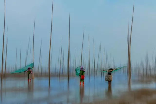 霞浦灘涂上以大面積的灰色為主,上面用于養(yǎng)殖的竹竿反光極為強(qiáng)烈,為了突出光影的效果,這些反光只能駕馭無法消除??梢钥紤]拍攝減少曝光量來進(jìn)行控制畫面的主體明度,達(dá)到增強(qiáng)光影效果的目的。選擇日落日出時(shí)段拍攝,化不利為有利。此時(shí)竹竿上的光比小,色溫暖,竹竿被夕陽染成了金色,為灘涂風(fēng)光造景造勢(shì)。曝光控制值要講究,如果對(duì)高光部位正確曝光,舍去暗部的細(xì)節(jié),得考慮到灘涂的竹竿在遠(yuǎn)處成像后非常細(xì)小,即使使用相機(jī)的點(diǎn)測(cè)光也無法測(cè)出高光部分的亮度,那 么只能使用評(píng)價(jià)測(cè)光來測(cè)量。曝光補(bǔ)償上減少2檔曝光。