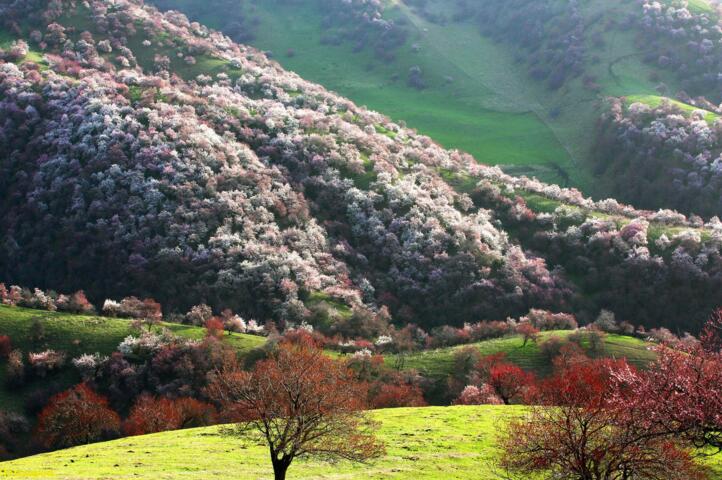 早餐后出發前往【中華福壽山景區】位于霍城縣西北的大西溝鄉境內,距伊寧市90公里,距縣城50公里。漫山遍野的杏花將景區裝點的風光如畫,美若仙境。景區內生長各類野果約60余種,以野酸梅、野蘋果、野核桃、杏、山楂為多,共有野生果樹幾十萬株。野酸梅是亞洲獨有的、唯一分布在伊犁河谷的罕見物種,其學名為櫻桃李。大西溝鄉是世界罕見、亞洲唯一野櫻桃李的原產地,被國家命名為“中國野生櫻桃李之鄉”。