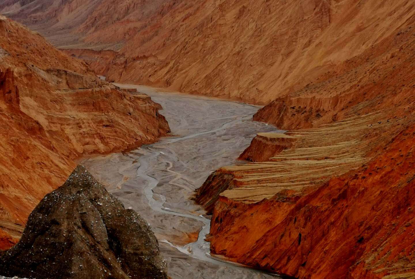 這是一個(gè)多彩的峽谷,河水是黃色的,一段峽谷的顏色是灰色的,遠(yuǎn)處藍(lán)天白云下,連綿的雪山,近處是綠色的草甸。另一段峽谷的顏色是大片的紅色,如赤紅的丹霞,這應(yīng)該是紅山大峽谷名字的來歷吧。