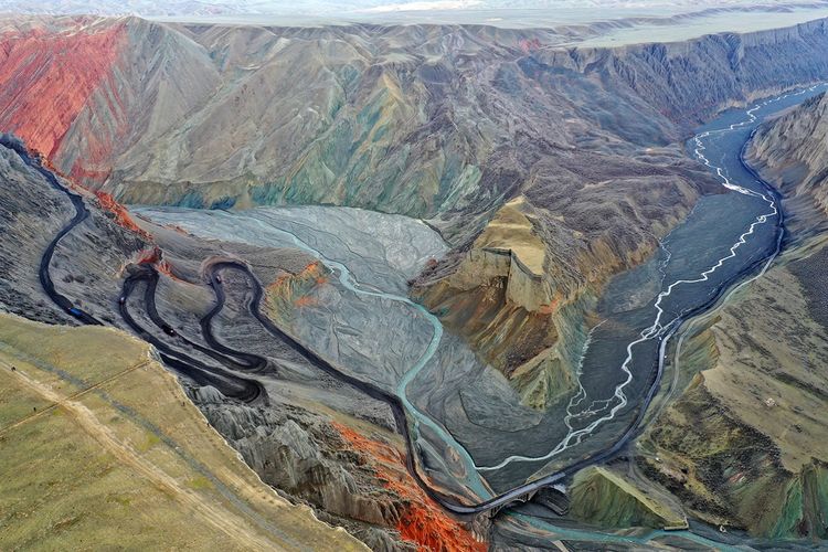 紅山大峽谷,位于新疆奎屯市安集海河流域,也稱安集海大峽谷。是兵團農七師紅山煤礦所在地。峽谷最深處約400米。縱橫交錯的溝壑,從峽谷邊緣一直延伸至谷底,形成險峻的“山峰”。“山峰”均由砂石和泥土組成,高則百米,猶如一把把利劍,“鋒芒”直指蒼穹。大峽谷以其險、奇而著稱,刀削斧劈的崖壁,蜿蜒曲折的流水,氣勢磅礴的深谷,色彩斑斕的奇石,以及象小甲蟲似的運煤卡車從谷底緩慢盤轉在陡峭彎曲小道上,象一個個跳動的音符,無不給幽深的峽谷增加了些許生機。