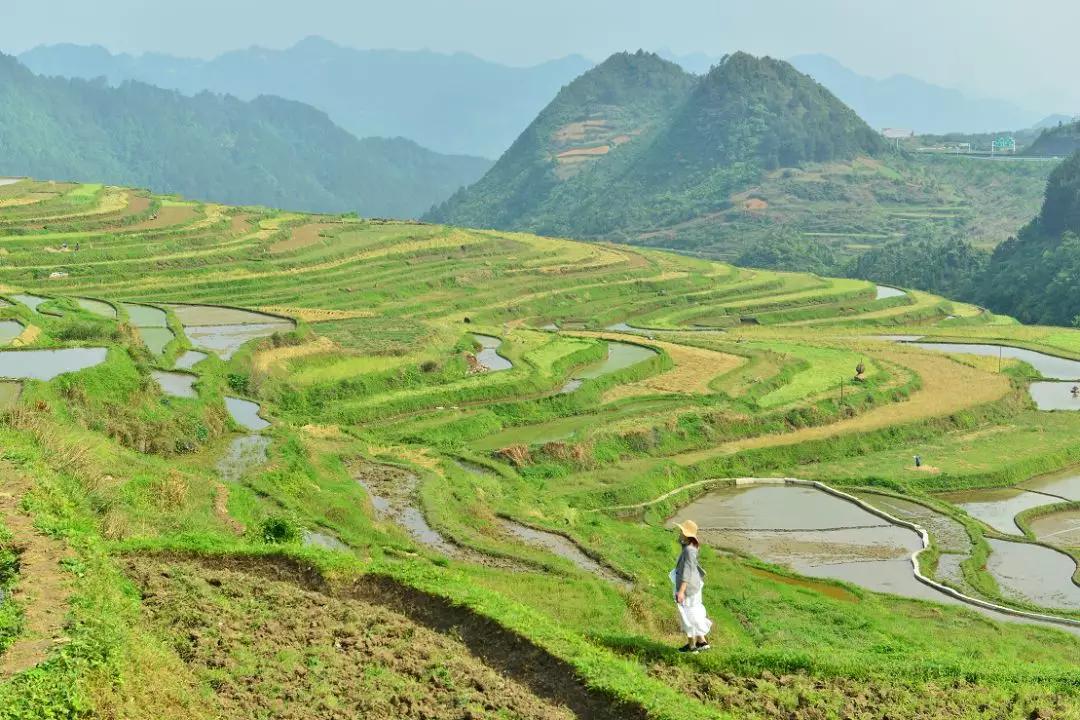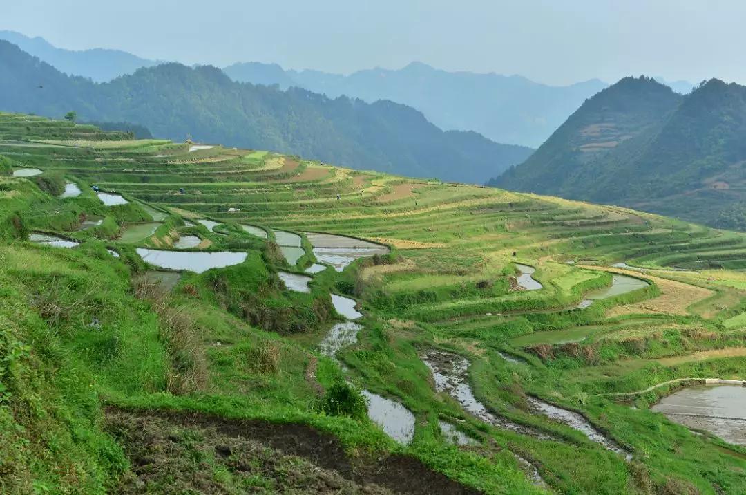 再往下走,梯田就映入眼簾了,一千多畝梯田景觀,位于一座大山之上,順著山勢,層層疊疊,從山頂一直延伸至山腳。