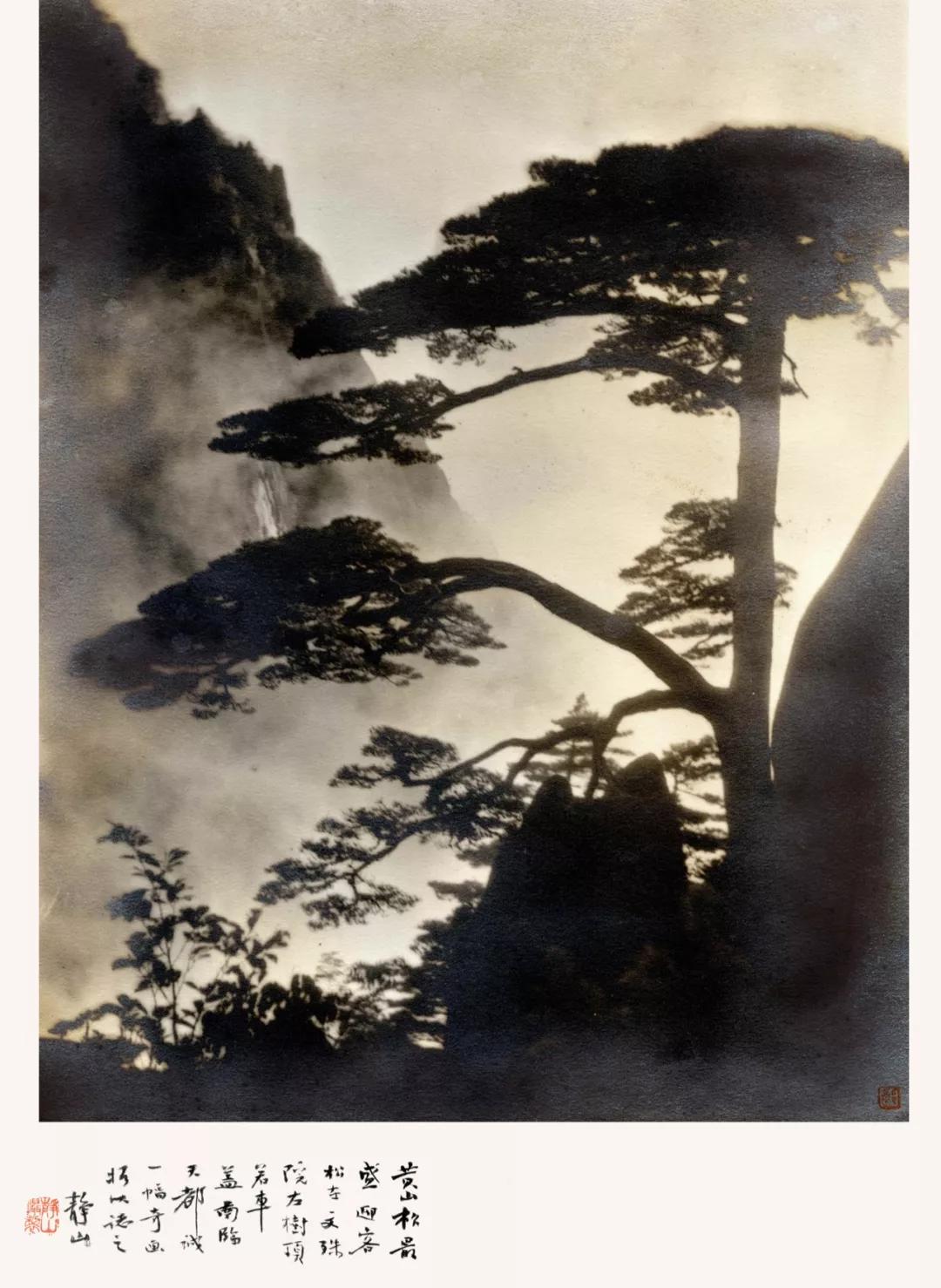 這件郎靜山創(chuàng)作的《云影松風(fēng)》是我數(shù)十年來(lái)花心思尋覓來(lái)的珍品,因年久而泛起的那層銀鹽黝澤,恍似絳云薄紗掩映著蒼松虬枝,迎送紛至沓來(lái)的游人,襯板上有其親筆題跋:“黃山松最盛,迎客松在文殊院左,樹(shù)頂若車(chē)蓋,南臨天都,誠(chéng)一幅奇畫(huà),攝以志之?!鼻橐?jiàn)乎辭,讀來(lái)神馳,我崇敬拍攝出如此雋永之作的老者,也理應(yīng)寬宥那些旨趣淺陋、無(wú)緣玩過(guò)120和135 菲林的后生。