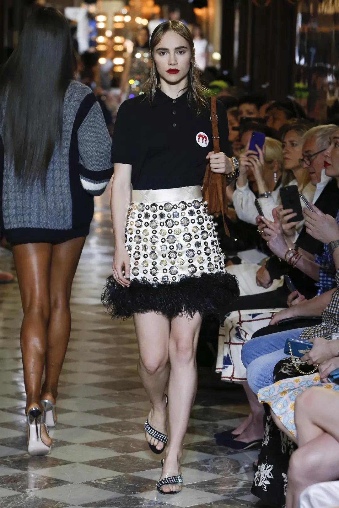 以Miu Miu 2019春夏度假系列為例,A型裙搭配Polo衫,完美再現(xiàn)了赫本風(fēng)貌,可裙子上的釘珠和羽毛,還是給《羅馬假日》中的淑女氣增添了幾分叛逆和華美,穿成這樣去度假,才是少女感的正確打開(kāi)方式。