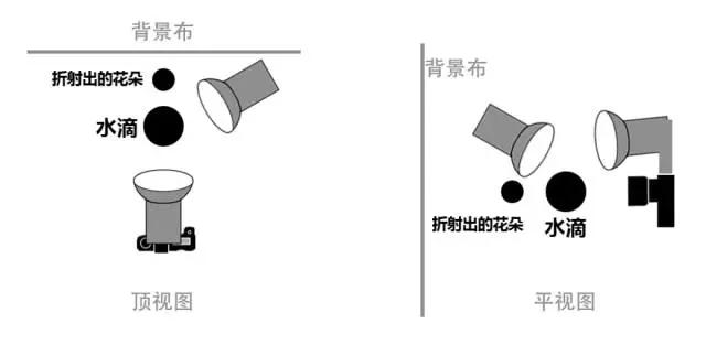 首先將花朵擺放在桌子上,然后用背景布遮擋住周圍雜亂的環(huán)境,用滴水的器材在花瓣上滴水,形成一個水滴。類似下圖中所示。
