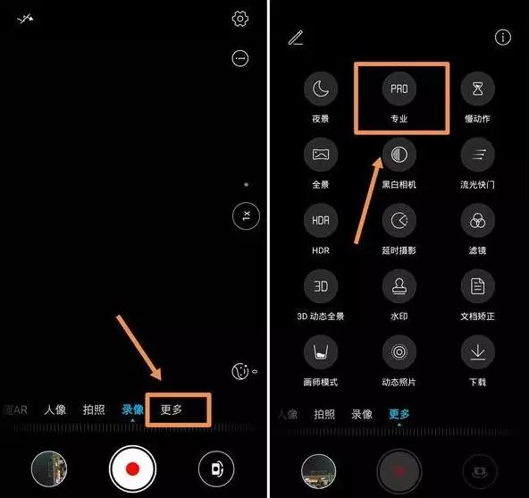 打開相機(jī)后,在主界面下面有個(gè)“更多”,我們點(diǎn)擊后界面上就會(huì)多出許多選項(xiàng),第二個(gè)就是“專業(yè)”模式(各個(gè)型號的專業(yè)模式方法開啟來不一樣,大家如果找不到,可自行搜索自己手機(jī)的打開方式)。