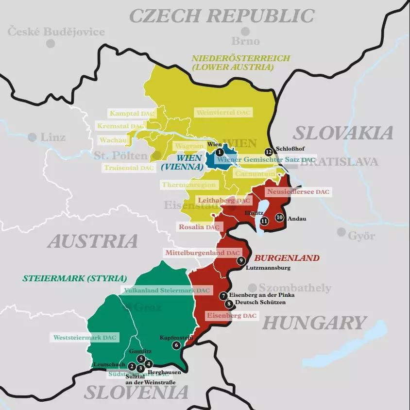 奧地利葡萄酒產區劃分為4個大區,共17個子產區。(西部零散葡萄園本文不做介紹)
