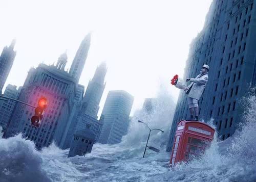 為什么這樣說?因為比起水平的地平線,略帶傾斜的地平線會更加具有動感,比如下面這張海報圖(不是真實拍出來的,只是拿來做個例子),它沒有一個明確的水平線,但是根據建筑物來參考,很明顯它是傾斜的,感覺人物站不穩隨時都要倒下去,這樣就營造了一種緊張的氛圍,有助于表達情緒。