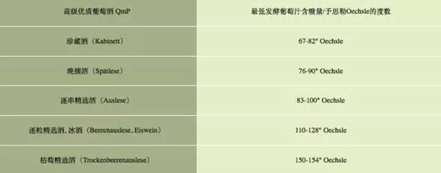 其最低含糖量的標準用予思勒(Oechsle)來表示,一度予思勒表明一升葡萄汁比一升水重一克,具體標準如下(其范圍是因為各產(chǎn)區(qū)標準不一):