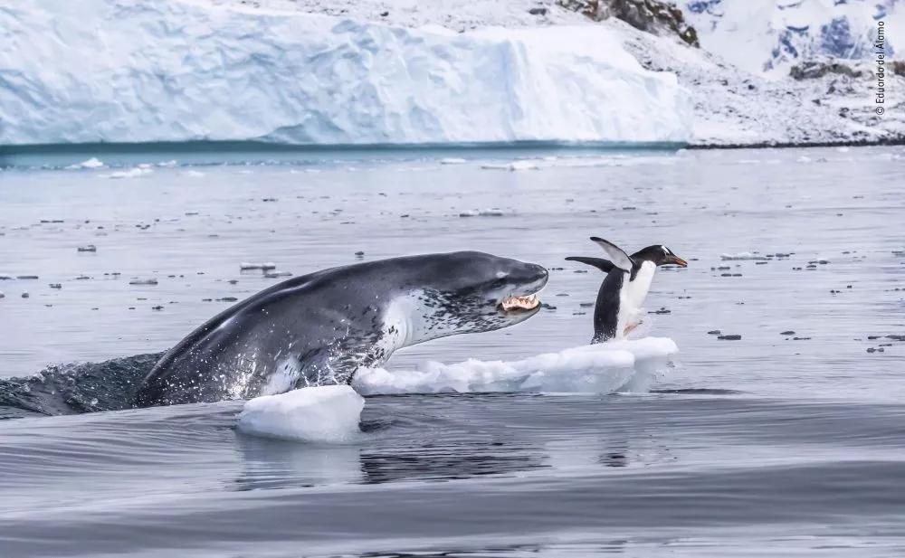 一只巴布亞企鵝正在一塊碎冰上小憩,突然間一只豹海豹從水面中沖出,長著大嘴,攻向這只企鵝。巴布亞企鵝已經是企鵝屆中游泳速度最快的選手了,它慌忙從碎冰上逃脫,但是在后面不慌不忙追趕的豹海豹此時似乎已經將這場捕獵當成了自己的游戲。