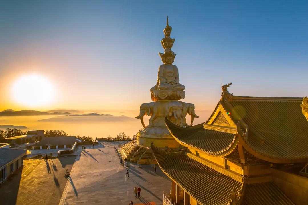 金頂擁有全世界最大的禮佛廣場(chǎng),在這里你可以朝拜48米高的【十方普賢】,與如織游人一起進(jìn)殿朝拜禮佛,披著金色日光與佛光交織而成的袈裟,體會(huì)全球最雄偉的佛教銅象的神圣和莊嚴(yán);或是順著那清幽的羊腸小道,感受“一山有四季,十里不同天”的自然景色;還可以在舍身崖俯瞰川西平原的優(yōu)美風(fēng)光,領(lǐng)閱一覽眾山小、風(fēng)光無限好的意境;