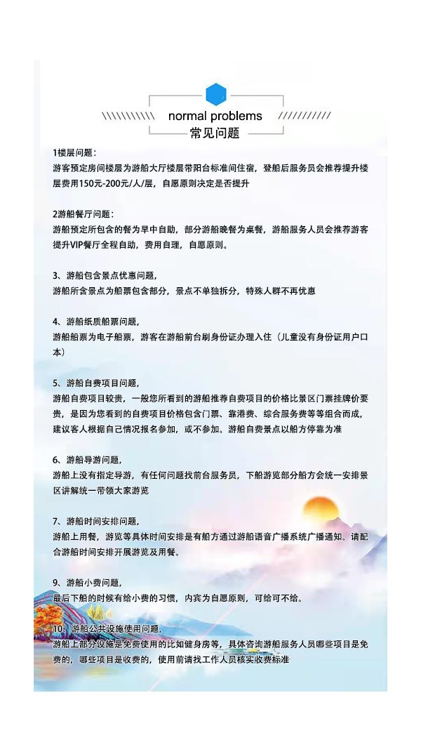 2由于游輪受長江水位/氣候/航道條件的影響,當出現水位過高或過低、大霧以及禁航管制等不可抗力情況,等船碼頭可能會改停豐都或涪陵碼頭,此種情況下船方會采取安排游客到重慶市內指定區域集合,乘坐大巴車前往下游在豐都或涪陵碼頭登船,乘車一般是3小時左右集體以實際行駛時間為準!少乘坐的這段船程無景點游覽安排,不會影響行程中景點游覽,游船公司安排車輛為游船統一散拼用車,不是單獨包車,會出現拼車的情況。游船公司不再收取額外的車費,也不會再對少坐船的這一段進行補償。選購此產品視作默認同意此條款。(是否從涪陵或豐都登船,以游船通知為準)。