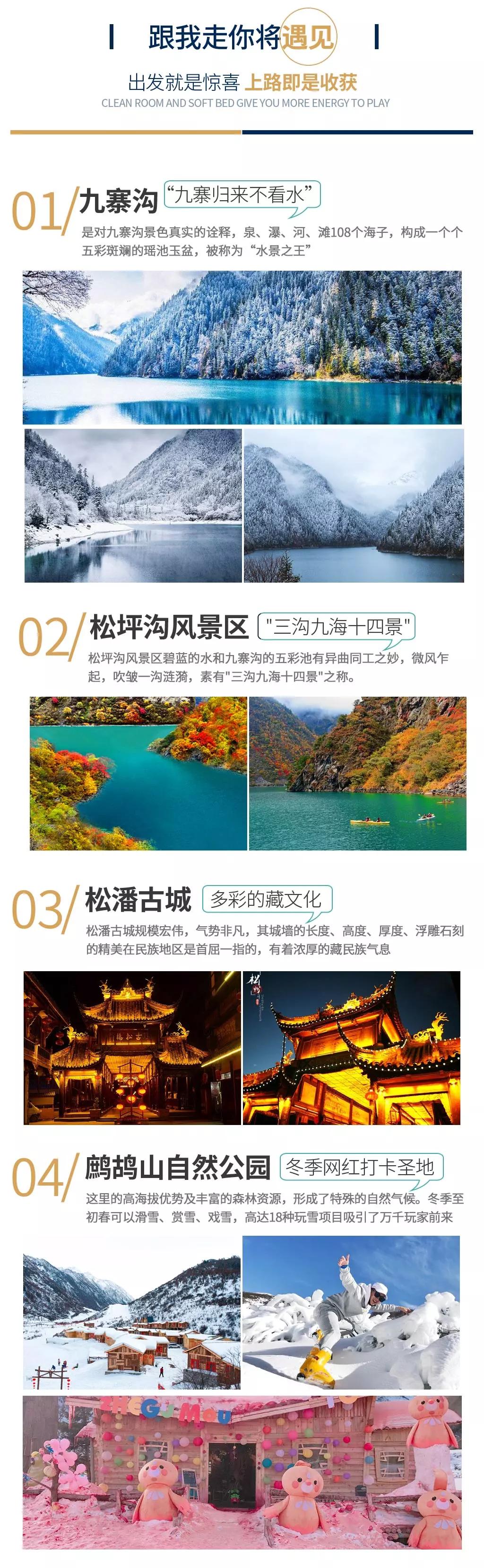 3、九寨溝面積較大游客需求不一,因此主要以游客自助游形式游覽,如無導游陪同望您諒解。游覽開始前導游會與您約定好集合時間,請務必按時到達指定地點,避免耽誤大家接下來的行程;