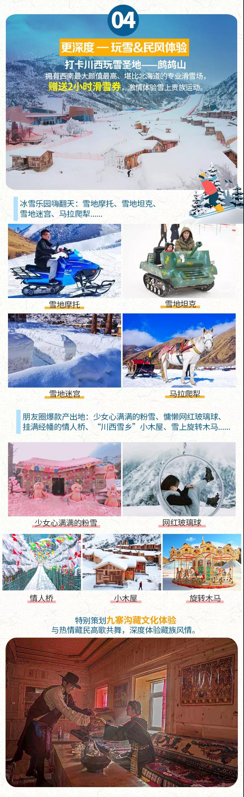 吃過精美的酒店自助早餐后我們開始我們的錯峰九寨滑雪之旅,途經汶川,最后抵達【鷓鴣山自然公園】。我們在景區門口換乘觀光車前往冰雪世界樂園景區。鷓鴣山自然公園山高谷深,風景秀麗,擁有優越的高山及森林資源,尤其是于冬季劃分的滑雪場、戲雪場2個獨立區域,多種游玩趣味和游玩方式更是吸引了成千上萬的“賞雪”“玩雪”愛好者前來,各式各樣高達18種的玩雪項目(自費項目具體可參考費用不含部分)能滿足大部分玩家的需求。在這里我們安排了2小時的雪上貴族運動——滑雪體驗,在專業滑道上來一次刺激的“雪上俯沖”,菜鳥級別的你在滑雪時,可能會與大地進行多次親密接觸,不過不摔兩跤又怎么能學會滑雪呢?