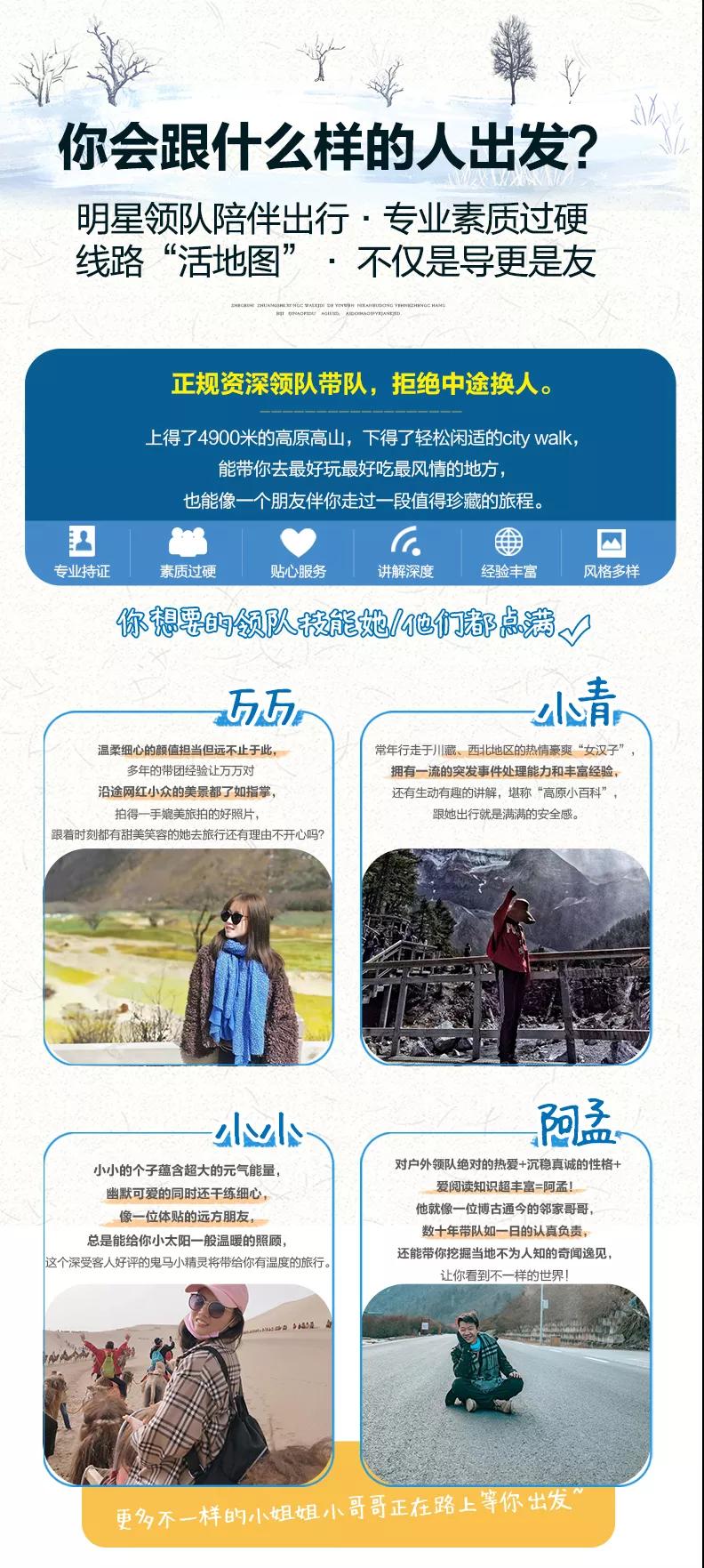4、如途中遇不可抗因素(如高原反應、修路、塌方、車輛事故阻礙等)我方有權根據情況調整行程線路走向,此舉均是根據帶隊經驗為大家更順利的游玩而做出的改變,希望大家理解和支持,但如造成額外費用由客人自理,望您諒解;若對行程造成影響的,我方將全力協助游客進行解決,但不承擔由此造成的損失,若因此而增加的費用,敬請游客自理。